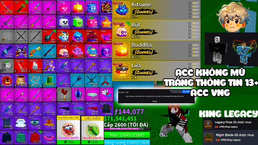 acc trắng thông tin 13+ không mũ full gamepass 8 slot rương Đồ như ảnh